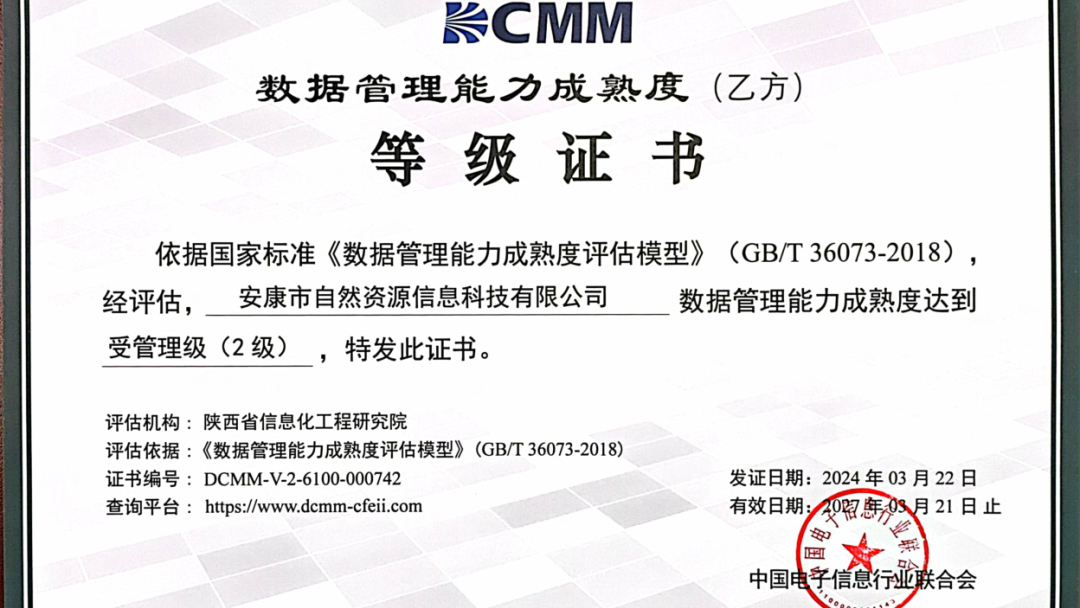 2024年3月,經中國電子信息行業聯合會審核確認,安康市自然資源信息科技有限公司順利取得數據管理能力成熟度(DCMM)等級認證。
